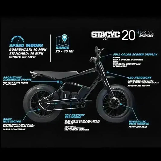 - 20HDrive — the first STACYC bike designed for adults, offering electric assistance and a fully electric riding experience. This generation uses a hub motor integrated into the rear wheel for a more modern riding feel.